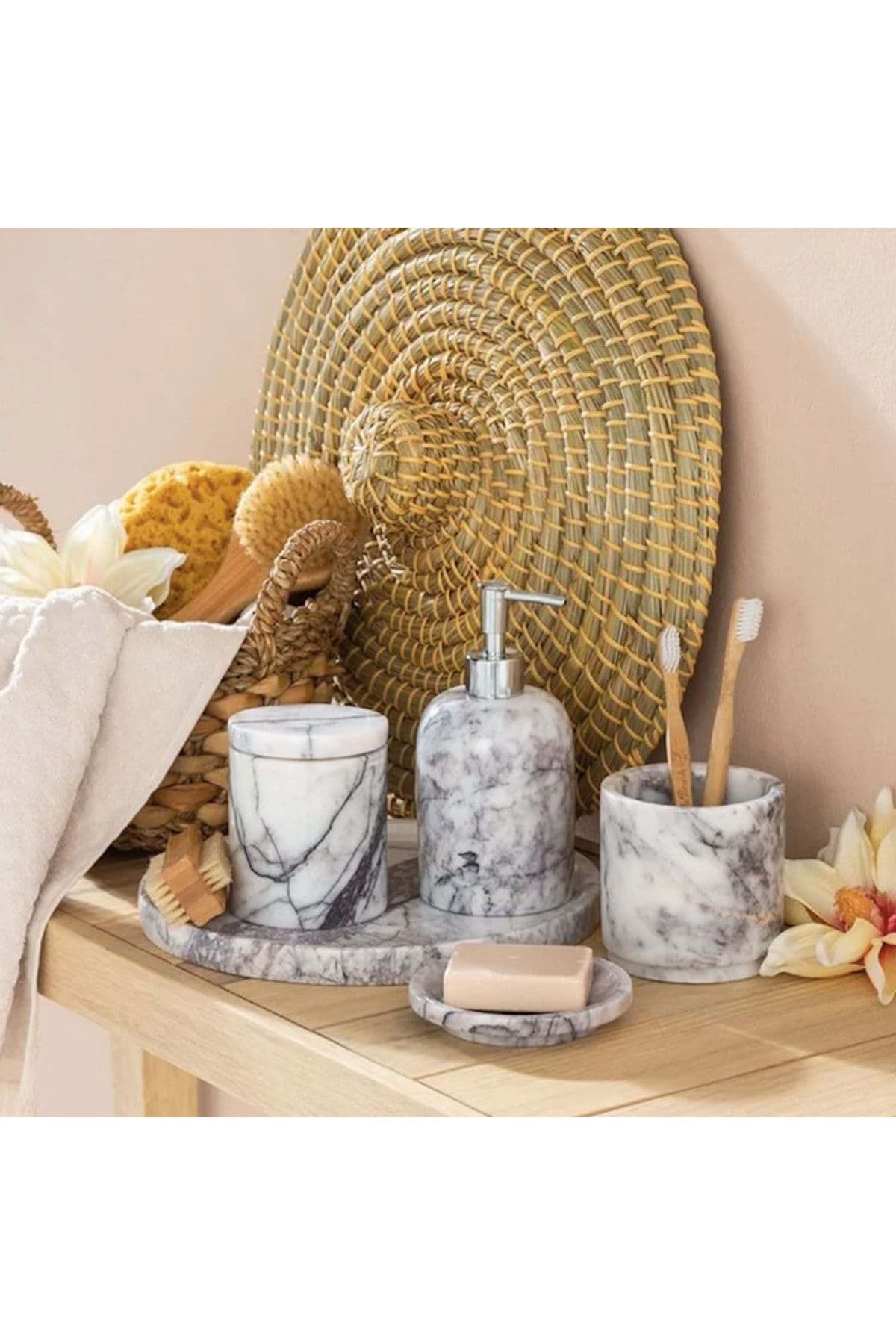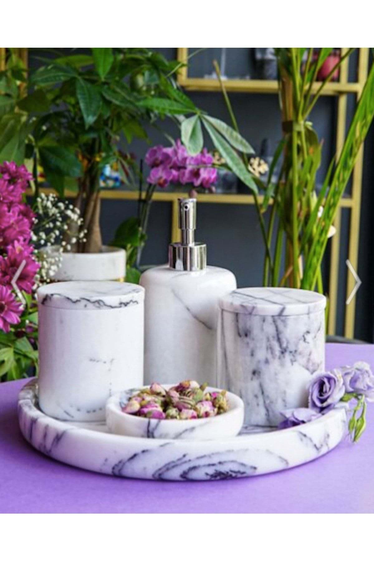 ÜRÜN %100 GERÇEK DOĞAL MERMERDEN ÜRETİLMİŞTİR. ; TEPSİ ÇAP 28 CM ; SIVI SABUNLUK ÇAP 8 CM YÜKSEKLİK 11 CM ; KATI SABUNLUK ÇAP 11 CM ; DİŞ FIRÇALIK ÇAP 8 CM YÜKSEKLİK 10 CM ; PAMUKLUK ÇAP 8.5 CM YÜKSEKLİK 11 CM ; ÜRÜN BEYAZ RENK VE PİRİNÇ AKSESUAR DETAYLIDIR. ;