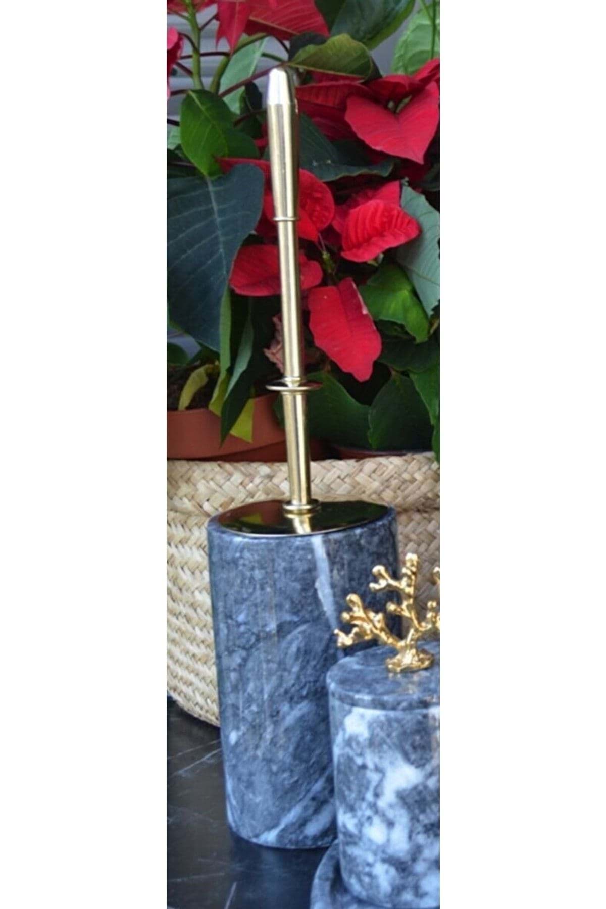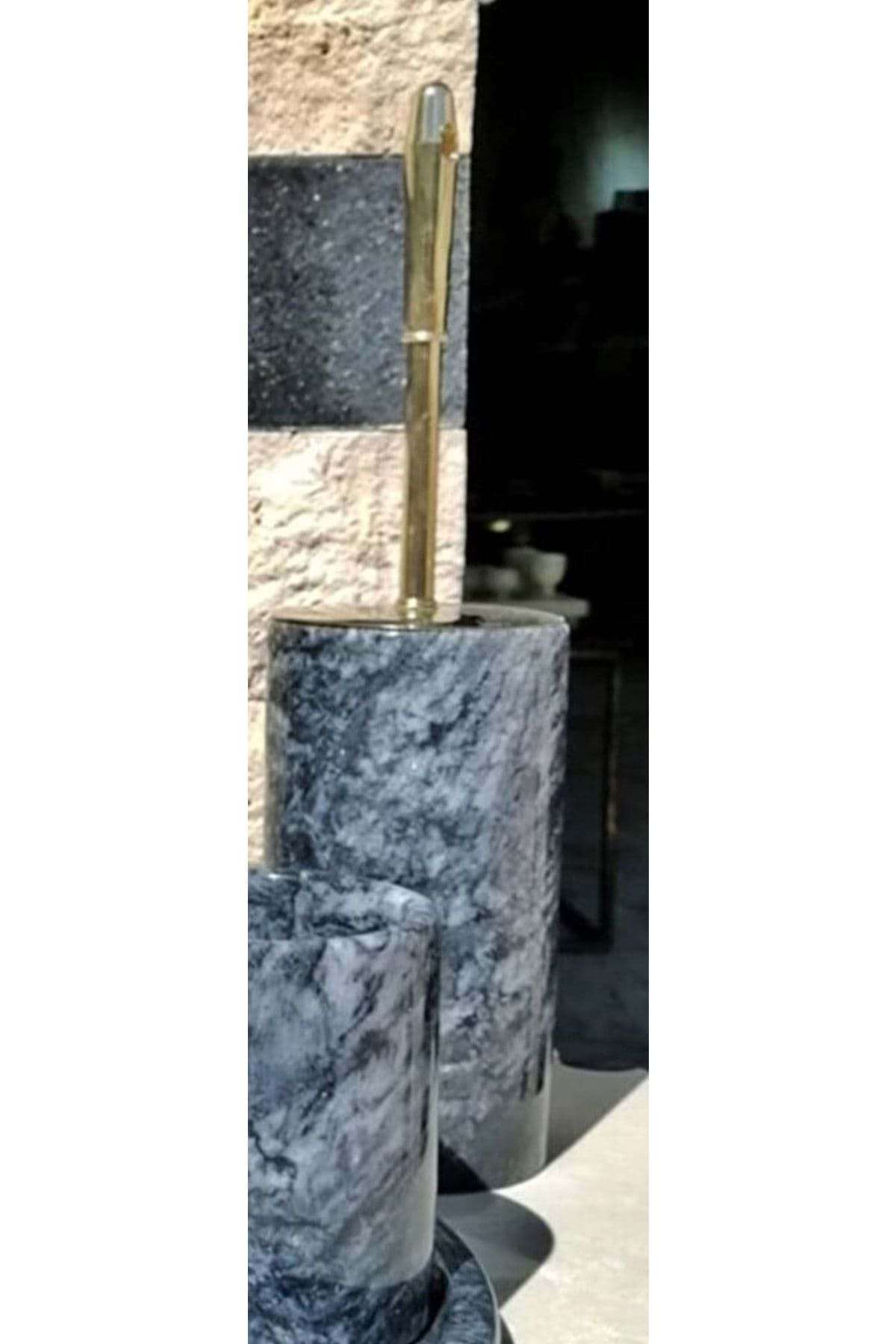 - Mermer malzemesi sayesinde, tuvalet fırçası hem şık hem de dayanıklı bir kullanım sunar; - Koyu gri ve siyah renk kombinasyonu ile modern ve zarif bir görünüm sağlar; - Altın detaylar, fırçanın estetik değerini artırarak banyonuzun dekorasyonuna sofistike bir dokunuş katar;